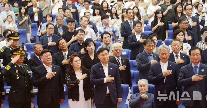 [전주=뉴시스] 김얼 기자 = 김관영(아랫줄 가운데) 전북특별자치도지사를 비롯한 관계자들이 15일 전북 전주시 전북특별자치도청 대공연장에서 열린 '제80주년 광복절 경축식'에 참석해 국기에 대한 경례를 하고 있다. 2025.08.15. [email protected]