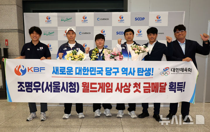 [인천공항=뉴시스] 배훈식 기자 = 당구 월드 챔피언 조명우(왼쪽 세번째)가 15일 오후 인천국제공항을 통해 입국한 뒤 기념촬영을 하고 있다. 조명우는 지난 14일 중국 쓰촨성 청두에서 열린 제12회 월드게임 당구 남자 캐롬 3쿠션에서 우승을 차지했다. 2025.08.15. [email protected]