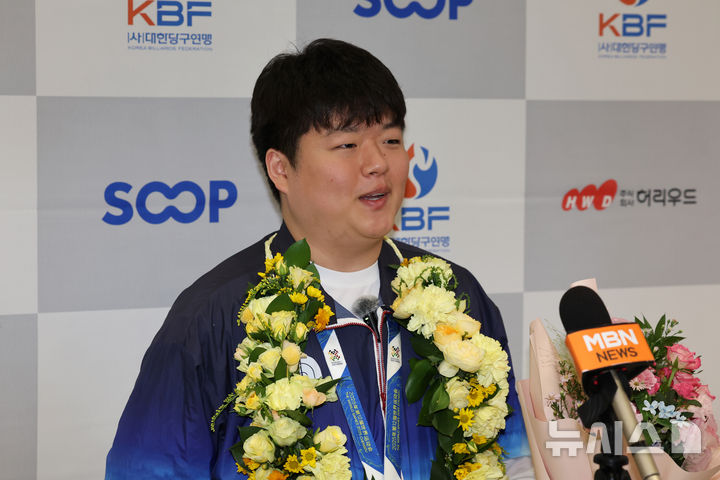 [인천공항=뉴시스] 배훈식 기자 = 당구 월드 챔피언 조명우가 15일 오후 인천국제공항을 통해 입국하며 취재진의 질문에 답하고 있다. 조명우는 지난 14일 중국 쓰촨성 청두에서 열린 제12회 월드게임 당구 남자 캐롬 3쿠션에서 우승을 차지했다. 2025.08.15. [email protected]