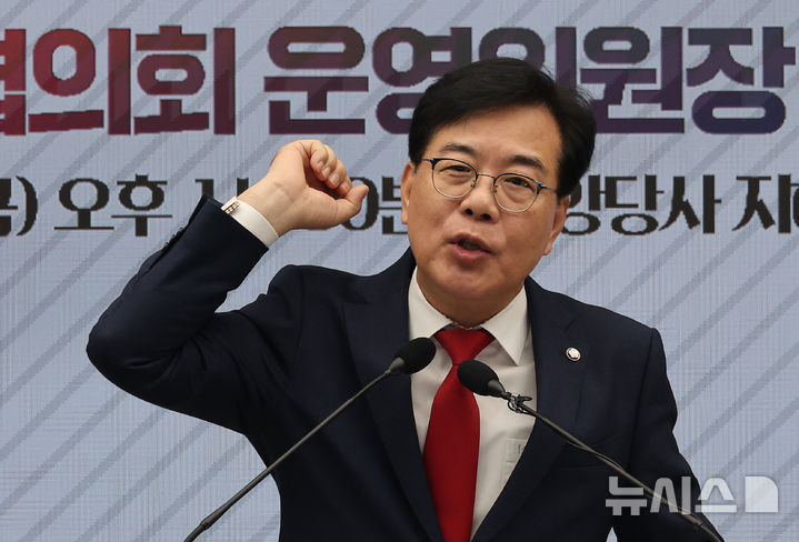 [서울=뉴시스] 김명년 기자 = 송언석 국민의힘 비상대책위원장 겸 원내대표가 15일 오후 서울 여의도 국민의힘 중앙당사에서 열린 2025 원외당원협의회 운영위원장 협의회 출범식에서 발언하고 있다. 2025.08.15. [email protected]