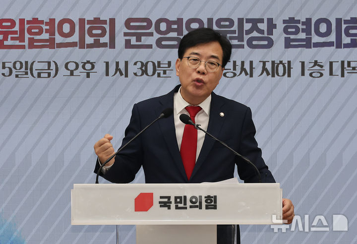 [서울=뉴시스] 김명년 기자 = 송언석 국민의힘 비상대책위원장 겸 원내대표가 15일 오후 서울 여의도 국민의힘 중앙당사에서 열린 2025 원외당원협의회 운영위원장 협의회 출범식에서 발언하고 있다. 2025.08.15. [email protected]