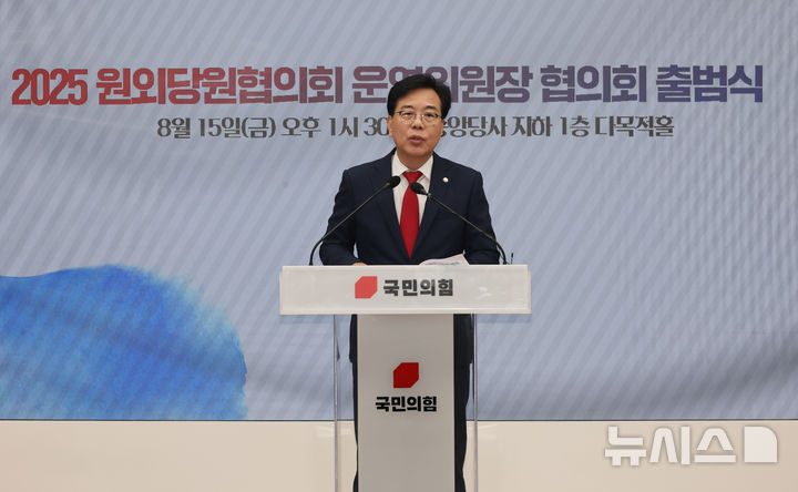 [서울=뉴시스] 김명년 기자 = 송언석 국민의힘 비상대책위원장 겸 원내대표가 15일 오후 서울 여의도 국민의힘 중앙당사에서 열린 2025 원외당원협의회 운영위원장 협의회 출범식에서 발언하고 있다. 2025.08.15. [email protected]