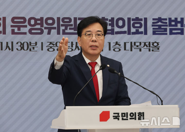 [서울=뉴시스] 김명년 기자 = 송언석 국민의힘 비상대책위원장 겸 원내대표가 15일 오후 서울 여의도 국민의힘 중앙당사에서 열린 2025 원외당원협의회 운영위원장 협의회 출범식에서 발언하고 있다. 2025.08.15. [email protected]