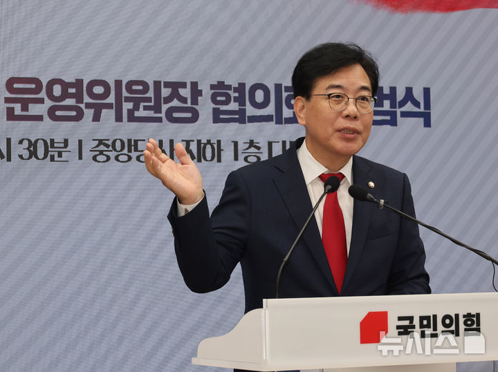 [서울=뉴시스] 김명년 기자 = 송언석 국민의힘 비상대책위원장 겸 원내대표가 15일 오후 서울 여의도 국민의힘 중앙당사에서 열린 2025 원외당원협의회 운영위원장 협의회 출범식에서 발언하고 있다. 2025.08.15. [email protected]
