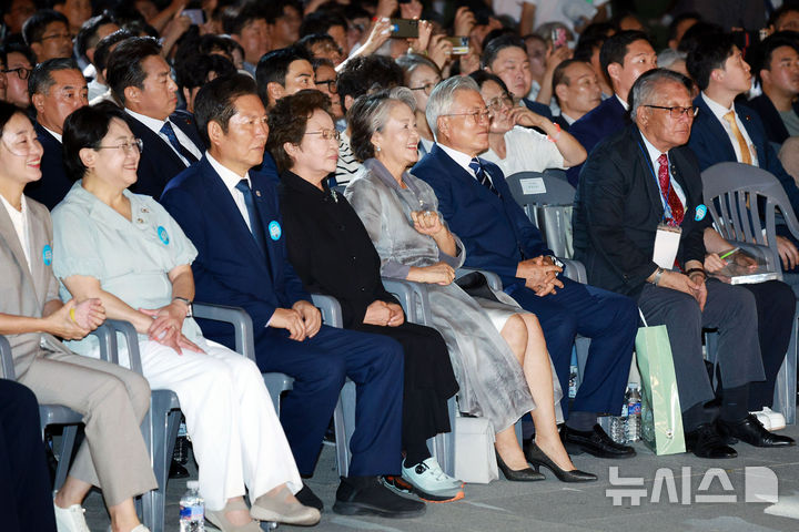 [서울=뉴시스] 고범준 기자 = 문재인 전 대통령 김정숙 여사, 권양숙 여사, 정청래 더불어민주당 대표 등 참석자들이 15일 서울 세종대로 광화문광장에서 열린 제21대 대통령 국민임명식 '광복 80년, 국민주권으로 미래를 세우다' 행사에서 공연 관람을 하고 있다. 2025.08.15. [email protected]