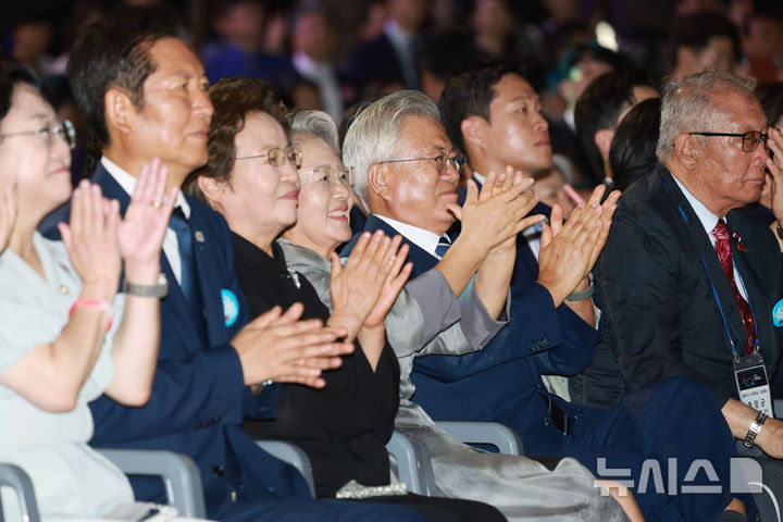 [서울=뉴시스] 고범준 기자 = 문재인 전 대통령, 김정숙 여사, 권양숙 여사, 정청래 더불어민주당 대표 등이 15일 서울 세종대로 광화문광장에서 열린 제21대 대통령 국민임명식 '광복 80년, 국민주권으로 미래를 세우다' 행사에서 공연 관람을 하고 있다. 2025.08.15. [email protected]