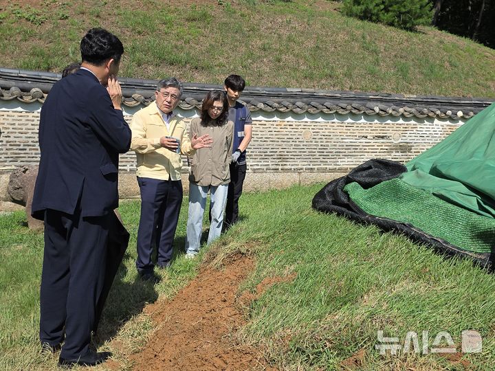 [서울=뉴시스] 허민 국가유산청장이 15일 오후 경기도 소재의 사적 ‘고양 서오릉’을 방문해 호우로 유실된 경릉 내 봉분 후면부 피해 상황을 관계자들과 점검하고 있다. (사진=국가유산청 제공) 2025.08.15. [email protected]