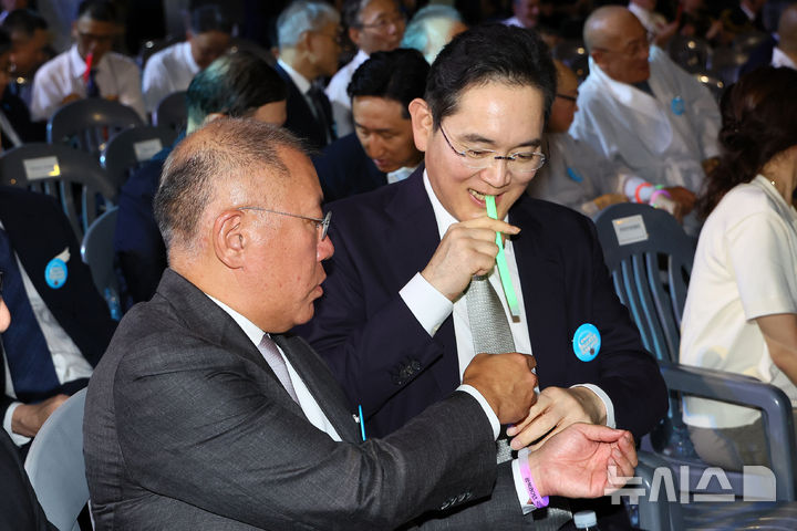 [서울=뉴시스] 고범준 기자 = 15일 서울 세종대로 광화문광장에서 열린 제21대 대통령 국민임명식 '광복 80년, 국민주권으로 미래를 세우다' 행사에서 이재용 삼성전자 회장이 정의선 현대차그룹 회장에게 야광팔찌를 채워주고 있다. 2025.08.15. [email protected]
