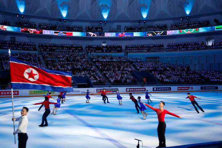 [평양=AP/뉴시스] 지난 14일 북한 평양에서 보통강변 빙상관 재개관식이 열려 축하 공연이 펼쳐지고 있다. 이 빙상장은 김일성 주석의 70세 생일을 맞아 1982년 4월 13일 문을 열었다가 이번에 재단장을 마치고 개관했다. 2025.08.16.
