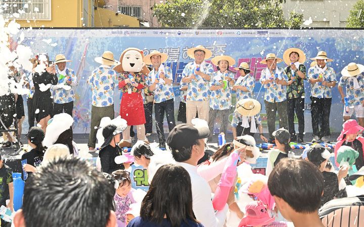 [울산=뉴시스] 구미현 기자 = 한낮 기온이 34도 까지 치솟은 16일 울산 중구 성남동 젊음의거리 kt빌딩 광장에서 '2025 워터버블 페스티벌'이 열리고 있다. 김영길 중구청장과 박경흠 중구의회 의장, 김병인 젊음의거리 상인회장, 시 구의원, 지역 주민, 어린이들이 물총 놀이를 하고 있다. 2025.08.16. (사진=울산시 중구 제공) [email protected]
