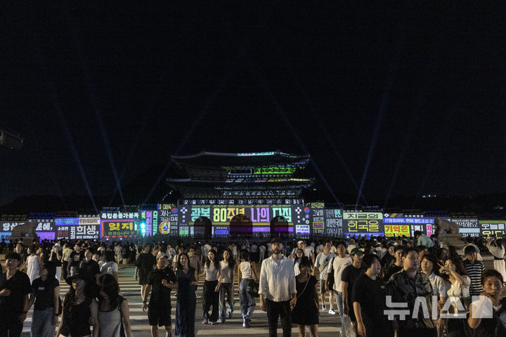 [서울=뉴시스] 김근수 기자 = 16일 서울 종로구 광화문광장에서 광복 80년 빛 축제 '80개의 빛, 하나된 우리'가 열려 광화문 외벽에 미디어 파사드 작품이 펼쳐지고 있다.