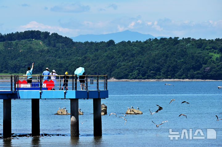 [사천=뉴시스] 차용현 기자 = 전국 대부분 지역에 폭염경보가 내려진 17일 오후 경남 사천시 석양길 인근 바닷가에서 시민들이 갈매기에게 먹이는 던져주며 즐거운 시간을 보내고 있다. 2025.08.17. [email protected]