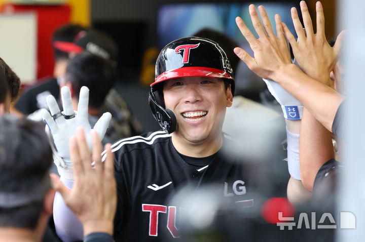 [인천=뉴시스] 황준선 기자 = 17일 인천 미추홀구 SSG랜더스필드에서 열린 2025 KBO리그 LG 트윈스와 SSG 랜더스의 경기, 무사 1루 상황 LG 김현수가 투런 홈런을 치고 동료들과 기쁨을 나누고 있다. 2025.08.17. [email protected]