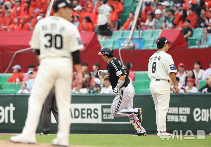 [인천=뉴시스] 황준선 기자 = 17일 인천 미추홀구 SSG랜더스필드에서 열린 2025 KBO리그 LG 트윈스와 SSG 랜더스의 경기, 무사 1루 상황 LG 김현수가 투런 홈런을 치고 그라운드를 돌고 있다. 2025.08.17. [email protected]