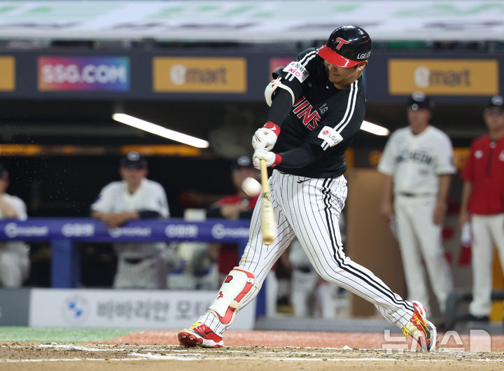 [인천=뉴시스] 황준선 기자 = 17일 인천 미추홀구 SSG랜더스필드에서 열린 2025 KBO리그 LG 트윈스와 SSG 랜더스의 경기, 6회 초 무사 주자 없는 상황 LG 문보경이 솔로 홈런을 치고 있다. 2025.08.17. [email protected]