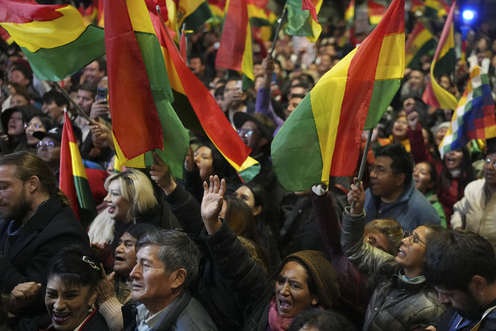 [라파스=AP/뉴시스] 로드리고 파스 볼리비아 대통령 후보 지지자들이 17일(현지 시간) 라파스에서 대선 출구 조사 선두 소식에 환호하고 있다. 파스 후보는 이날 대선 출구 조사에서 예상을 깨고 1위를 기록하고 있는 것으로 나타났다. 2025.08.18.