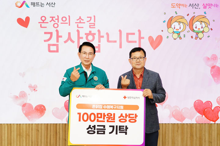 [서산=뉴시스] 김덕진 기자=양희정(오른쪽) 대산읍 소재 촌닭집 사장이 18일 서산시청 시장실에서 이완섭 시장에게 수해 복구 성금 100만원을 기탁한 후 기념 사진을 찍고 있다. (사진=서산시 제공) 2025.08.18. [email protected]