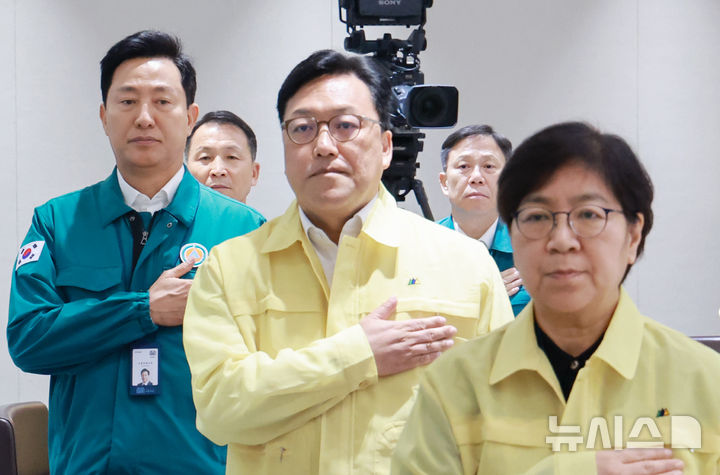 [서울=뉴시스] 고범준 기자 = 오세훈 서울시장이 18일 서울 용산 대통령실 청사에서 열린 제1회 을지국무회의 및 제37회 국무회의에서 국민의례를 하고 있다. 왼쪽부터 오 시장, 김병환 금융위원장, 정은경 보건복지부 장관. (대통령실통신사진기자단) 2025.08.18. [email protected]