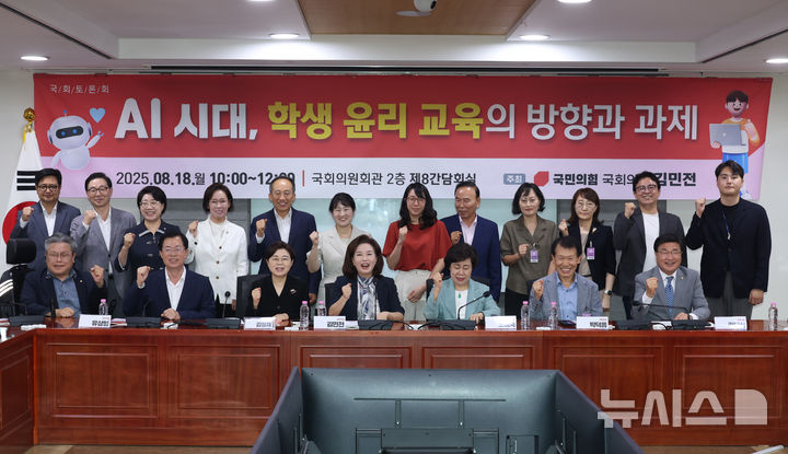 [서울=뉴시스] 고승민 기자 = 국민의힘 김정재 정책위의장과 김민전 의원 등 참석자들이 18일 서울 여의도 국회 의원회관에서 열린 AI시대, 학생 윤리 교육의 방향과 과제 토론회에서 기념촬영하고 있다. 2025.08.18. [email protected]