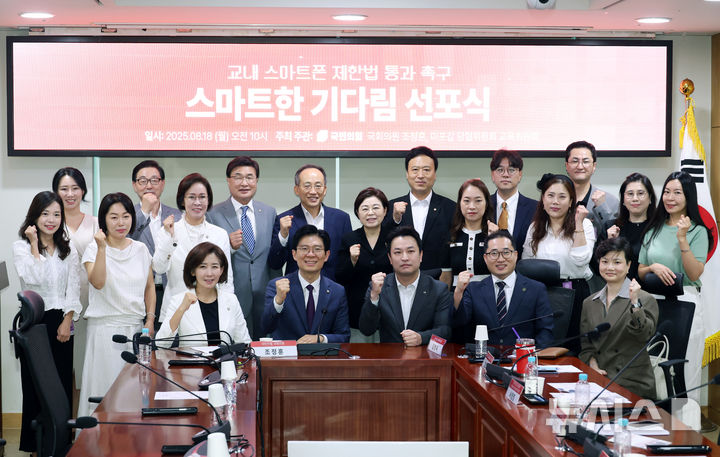 [서울=뉴시스] 고승민 기자 = 국민의힘 김정재 정책위의장과 조정훈 의원 등 참석자들이 18일 서울 여의도 국회 의원회관에서 열린 교내 스마트폰 제한법 통과 촉구 스마트한 기다림 선포식에서 기념촬영을 하고 있다. 2025.08.18. [email protected]