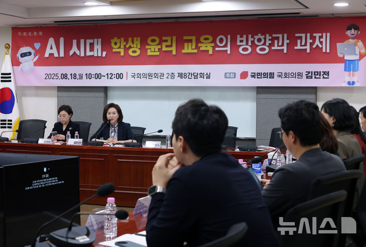 [서울=뉴시스] 고승민 기자 = 김민전 국민의힘 의원이 18일 서울 여의도 국회 의원회관에서 열린 AI시대, 학생 윤리 교육의 방향과 과제 토론회에서 인사말을 하고 있다. 2025.08.18. [email protected]