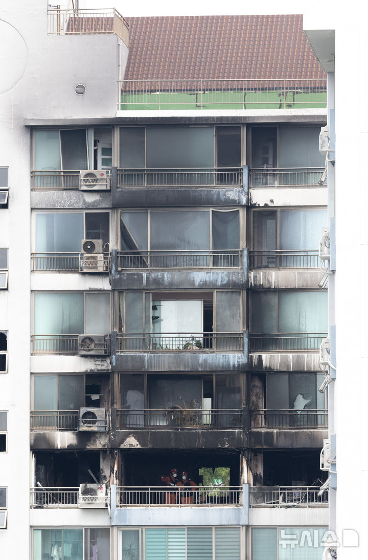 [서울=뉴시스] 황준선 기자 = 18일 오전 서울 마포구 창전동 아파트 화재 현장에서 경찰·소방 관계자들이 합동감식을 하고 있다. 2025.08.18. [email protected]