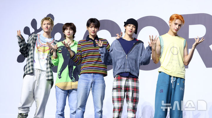[서울=뉴시스] 김혜진 기자 = 그룹 코르티스(왼쪽부터 마틴, 주훈, 건호, 성현, 제임스)가 18일 오후 서울 용산구 블루스퀘어에서 열린 데뷔 쇼케이스 '컬러 아웃사이드 더 라인스'(COLOR OUTSIDE THE LINES) 발매 기념 쇼케이스에서 포즈를 취하고 있다.
