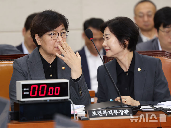 [서울=뉴시스] 김명년 기자 = 정은경 보건복지부 장관이 18일 오후 서울 여의도 국회 보건복지위원회 전체회의에서 이스란 1차관과 대화하고 있다. 2025.08.18. [email protected]