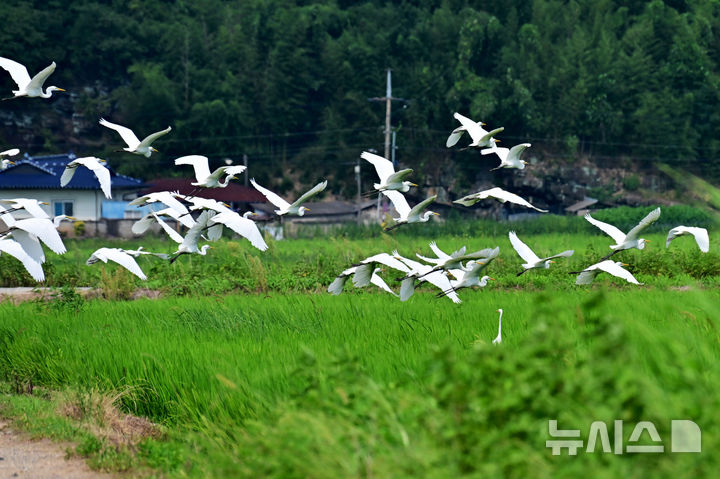 [하동=뉴시스] 차용현 기자 = 전국 대부분 지역에 폭염경보가 내려진 18일 오후 경남 하동군 진교면 인근 들녘에서 휴식을 취하던 백로 한 무리가 인기척에 놀라 날아오르고 있다. 2025.08.18. [email protected]