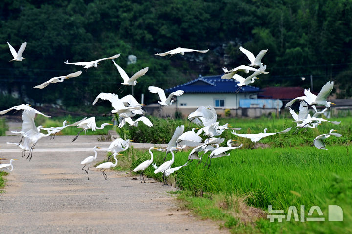 [하동=뉴시스] 차용현 기자 = 전국 대부분 지역에 폭염경보가 내려진 18일 오후 경남 하동군 진교면 인근 들녘에서 휴식을 취하던 백로 한 무리가 인기척에 놀라 날아오르고 있다. 2025.08.18. [email protected]