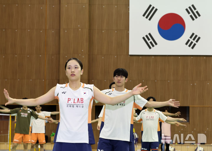 [진천=뉴시스] 배훈식 기자 = 대한민국 배드민턴 대표 선수들이 18일 오후 충북 진천군 국가대표선수촌에서 훈련에 앞서 몸을 풀고 하고 있다.  2025.08.18. [email protected]