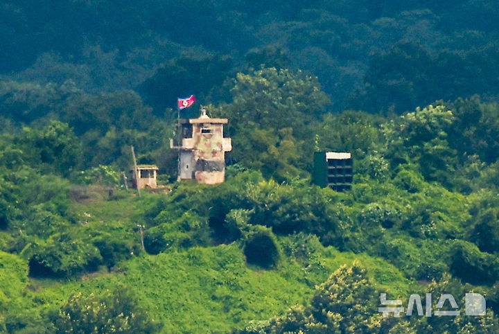 [파주=뉴시스] 정병혁 기자 = 19일 경기 파주시 통일전망대에서 북한 황해북도 개풍군 일대 북측 초소에 대남 확성기가 설치되어 있다.
