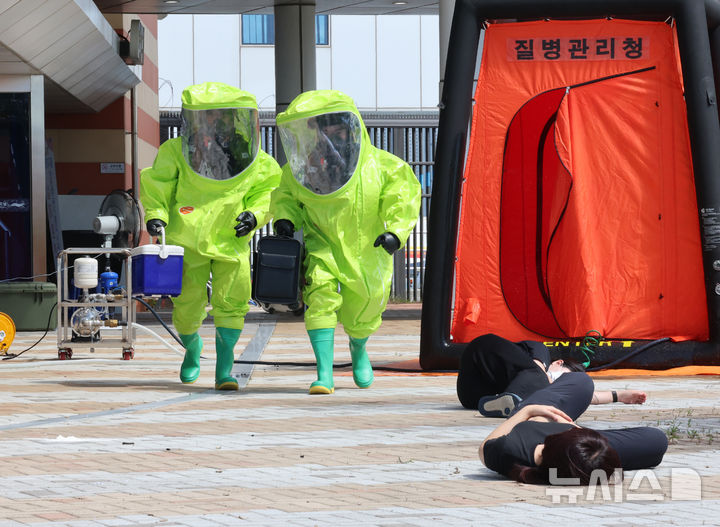 [인천=뉴시스] 전진환 기자 = 19일 오후 인천 연수구 크루즈터미널에서 2025 을지훈련의 일환으로 진행된 인천 국가 중요 시설 통합방호 실제훈련에서 국립인천검역소 직원들이 화생방 오염지역으로 출동하고 있다. 2025.08.19. [email protected]