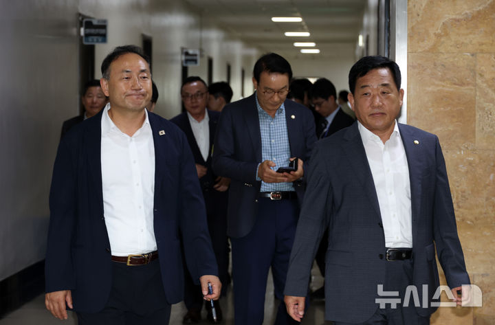 [서울=뉴시스] 김금보 기자 = 국회 산업통상자원중소벤처기업위원회 김원이(왼쪽) 더불어민주당, 박성민 국민의힘 간사가 19일 오후 서울 여의도 국회에서 전체회의 정회 중 협의를 마친 후 회의장으로 이동하고 있다. 2025.08.19. [email protected]