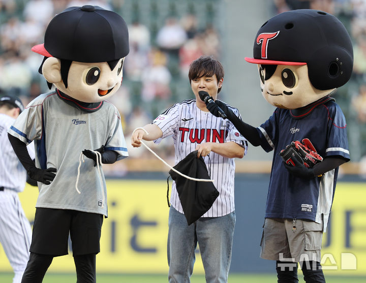 [서울=뉴시스] 김진아 기자 = 마술사 최현우가 19일 서울 송파구 잠실야구장에서 열린 2025 KBO리그 롯데 자이언츠와 LG 트윈스의 경기에서 시구를 하기 앞서 마술을 선보이고 있다. 2025.08.19. [email protected]