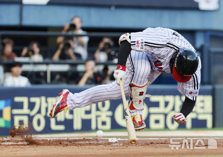 [서울=뉴시스] 김진아 기자 = 19일 서울 송파구 잠실야구장에서 열린 2025 KBO리그 롯데 자이언츠와 LG 트윈스의 경기, 1회말 1사 1,2루 LG 문보경이 본인의 파울타구를 맞고 넘어지고 있다. 2025.08.19. [email protected]