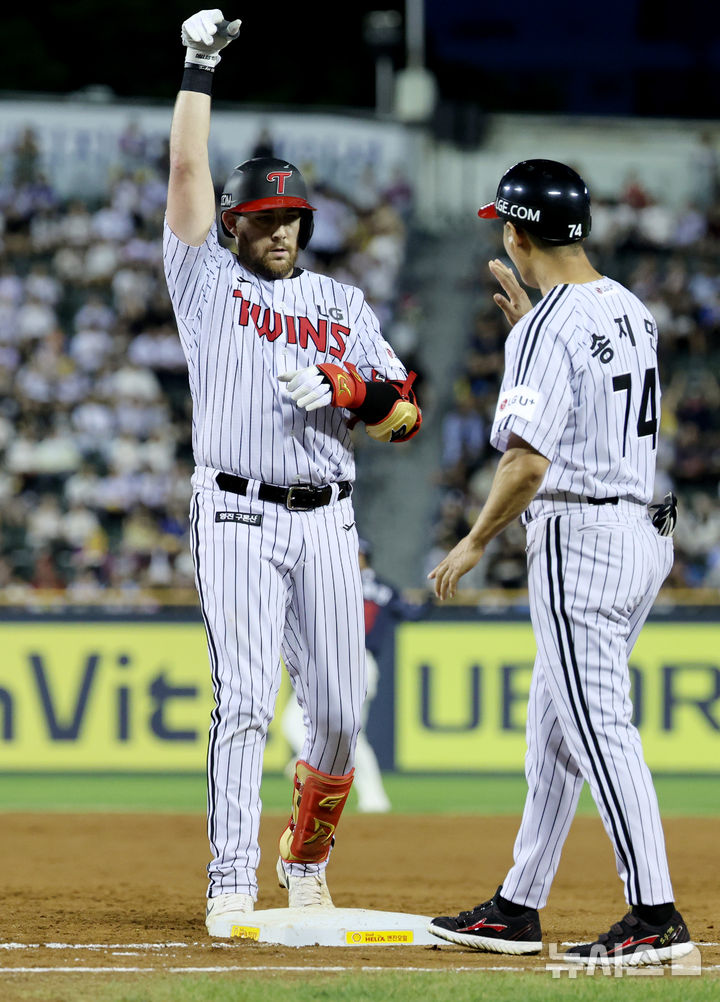 [서울=뉴시스] 김진아 기자 = 19일 서울 송파구 잠실야구장에서 열린 2025 KBO리그 롯데 자이언츠와 LG 트윈스의 경기, 4회말 무사 LG 오스틴이 안타를 친 뒤 기뻐하고 있다. 2025.08.19. [email protected]