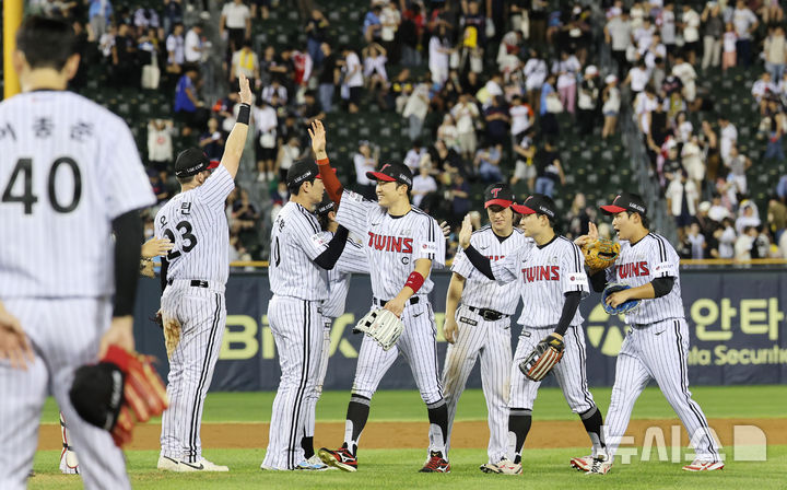 [서울=뉴시스] 김진아 기자 =  19일 서울 송파구 잠실야구장에서 열린 2025 KBO리그 롯데 자이언츠와 LG 트윈스의 경기, 5-2으로 승리한 LG 선수들이 기뻐하고 있다. 2025.08.19. [email protected]