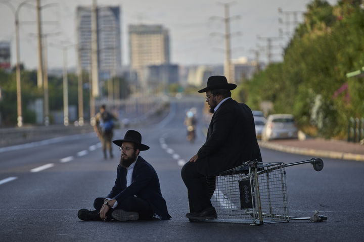 [브네이 브라크=AP/뉴시스] 19일(현지 시간) 이스라엘 텔아비브 동부 초정통파 유대인 거주지인 브네이 브라크에서 초정통파 유대인들이 고속도로를 막고 군 징집 반대 시위를 벌이고 있다. 2025.08.20.