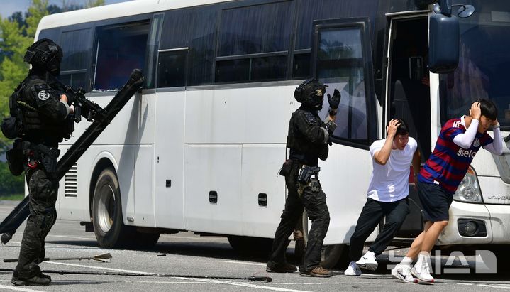 [광주=뉴시스] 이현행 기자 = 20일 오전 광주 서구 월드컵경기장 일대에서 펼쳐진 2025 을지연습 세계양궁선수권 대회 대테러 훈련 도중 경찰특공대가 납치된 선수단을 구출하고 있다. 2025.08.20. [email protected]