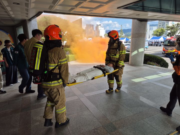 [영동=뉴시스] 충북 영동군 8개 기관이 20일 영동읍 군청사 주차장에서 '2025 을지연습' 대테러·화재 훈련'을 벌이고 있다. 군청사가 폭발물과 드론에 피폭된 상황을 가상한 훈련에서 영동군과 영동경찰서, 영동소방서, 육군 2201부대 2대대, 육군 6606부대는 상황을 전파하고, 테러를 진압하고, 응급구조·구급 활동을 시행했다. (사진=영동군 제공) 2025.08.20. [email protected]