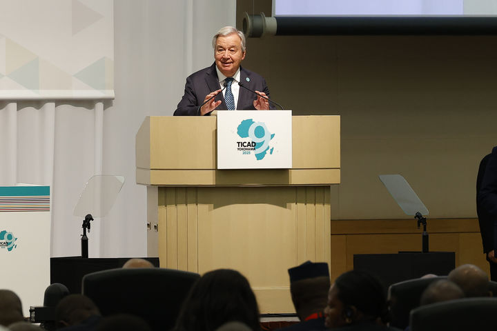 [요코하마=AP/뉴시스] 안토니우 구테흐스 유엔 사무총장이 20일 일본 도쿄 인근 요코하마에서 열린 제9차 아프리카 개발회의(TICAD9) 개회식에서 기조연설하고 있다. TICAD는  일본 정부 주도로 1993년부터 시작된 아프리카 개발 관련 국제회의다. 2025.08.20.