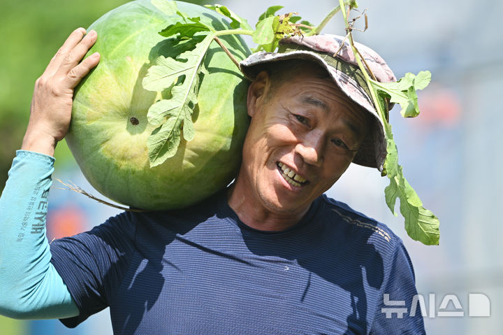 [광주=뉴시스] 이영주 기자 = 광주 특산물 무등산 수박 출하를 이틀 앞둔 20일 오전 광주 북구 금곡동 무등산 수박 공동직판장 주변 재배 농가에서 문용덕(61)씨가 무등산 수박을 수확해오고 있다. 2025.08.20. [email protected]