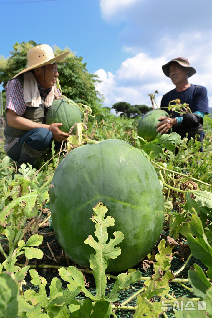 [광주=뉴시스] 이영주 기자 = 광주 특산물 무등산 수박 출하를 이틀 앞둔 20일 오전 광주 북구 금곡동 무등산 수박 공동직판장 주변 재배 농가에서 김영기(68·왼쪽) 무등산수박영농조합법인회장과 문용덕(61)씨가 무등산 수박을 수확하고 있다. 2025.08.20. [email protected]