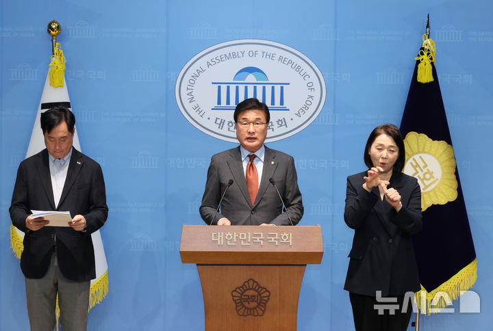 [서울=뉴시스] 김금보 기자 = 김대식(가운데) 국민의힘 의원과 김준혁(왼쪽) 더불어민주당 의원이 20일 서울 여의도 국회 소통관에서 '인공지능 인재 육성 및 활용에 관한 특별법' 공동 대표 발의 기자회견을 하고 있다. 2025.08.20. [email protected]