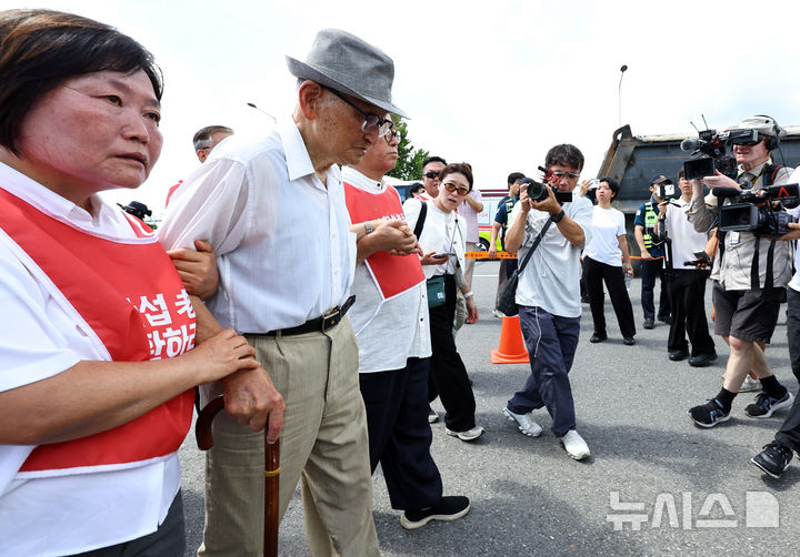 [파주=뉴시스] 최진석 기자 = 전쟁포로인 비전향장기수 안학섭 씨가 20일 경기 파주 통일대교남단에서 안학섭송환추진단과 함께 검문소를 향해 이동하고 있다. 2025.08.20. [email protected]