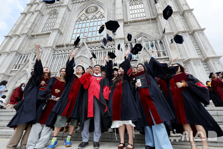 [서울=뉴시스] 김진아 기자 = 20일 서울 동대문구 경희대학교에서 열린 2024학년도 후기 학위수여식을 마친 졸업생들이 대학원장과 함께 학사모를 던지며 기념촬영을 하고 있다. 2025.08.20. [email protected]