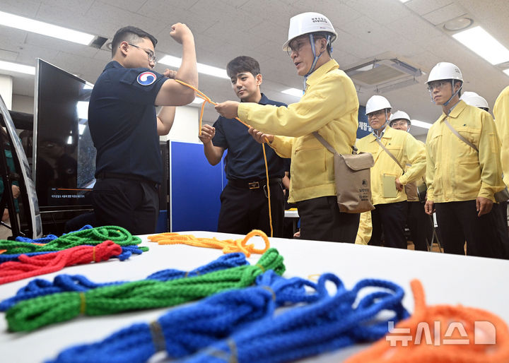 [서울=뉴시스] 추상철 기자 = 김민석 국무총리가 20일 오후 서울 종로구 정부서울청사에서 열린 공습대비 민방위 대피 훈련에서 매듭법 시연을 하고 있다. (공동취재) 2025.08.20. [email protected]