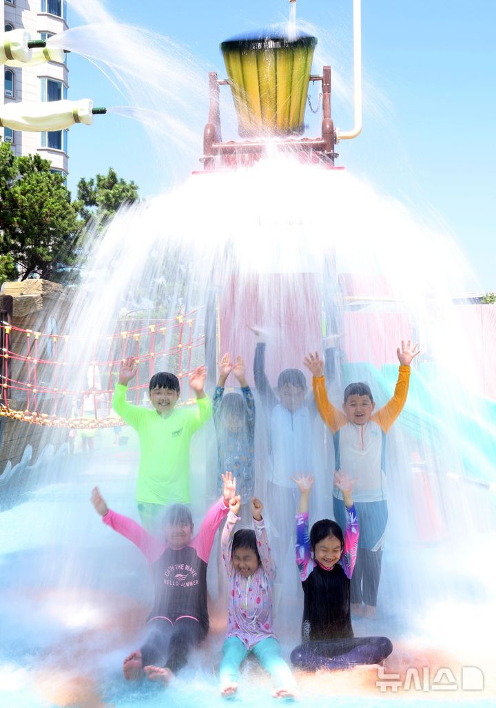[부산=뉴시스] 하경민 기자 = 부산지역에 폭염경보가 발효 중인 20일 수영구 어린이 워터파크에서 어린이들이 시원한 물벼락을 맞으며 더위를 식히고 있다. 2025.08.20. [email protected]