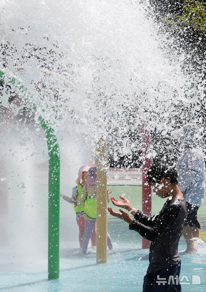 [부산=뉴시스] 하경민 기자 = 부산지역에 폭염경보가 발효 중인 20일 수영구 어린이 워터파크에서 어린이들이 시원한 물벼락을 맞으며 더위를 식히고 있다. 2025.08.20. [email protected]
